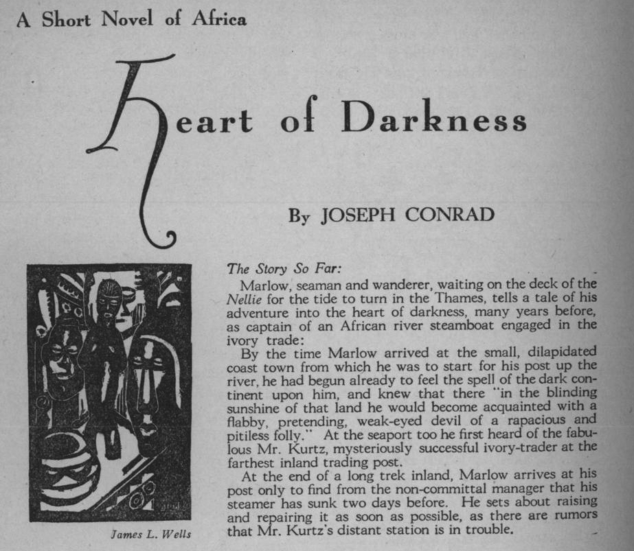 Perhaps because of its established place in the American classroom, Joseph Conrad’s Heart of Darkness (1902) has been subjected to a range of thematic interpretations. If you need a reminder, the basic narrative of the novella concerns a British sailor (Charles Marlow) who is hired by an ivory trading company to guide a steamship into the heart of the Congo. The journey forces the protagonist to confront harsh truths of the European presence in Africa, which in turn puts pressure on the distinction between supposedly civilized and savage worlds.
